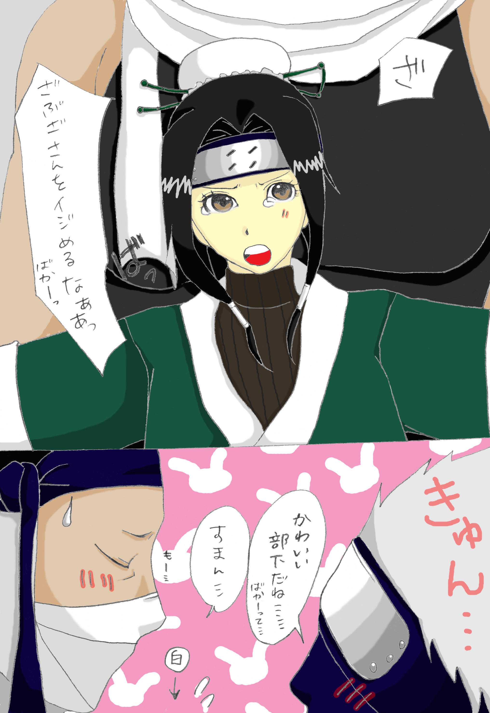 一礼した再不斬さんの頭を見て、先輩に対して礼儀正しい子だよね、君みたいに…と栗霰さんは雪のような少年、白を思い浮かべました。